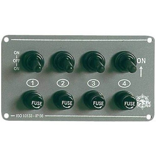 Grado di protezione IP56. Il primo a 3 posizioni (ON-OFF-ON) con 2 circuiti separati, l’ultimo con ritorno a molla per tromba. Carico garantito 15 A con cappuccio in gomma e portafusibili in vetro da 6×32 mm. Pannello in alluminio anodizzato grigia.