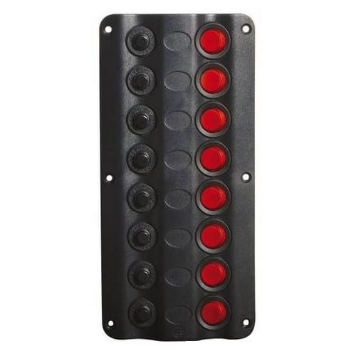 Pannello con 8 interruttori impermeabili, spie LED e valvole automatiche reinseribili.
