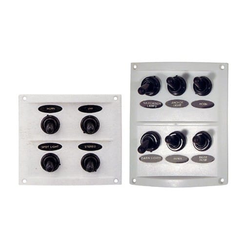 Pannello elettrico di colore bianco con interruttori a stagno e fusibili. Resistente ai raggi UV, cappucci in neoprene e fusibili in linea dietro il pannello. Completo di simboli adesivi.