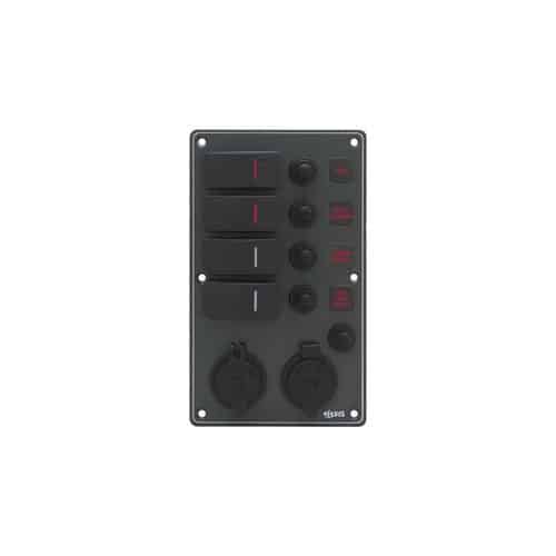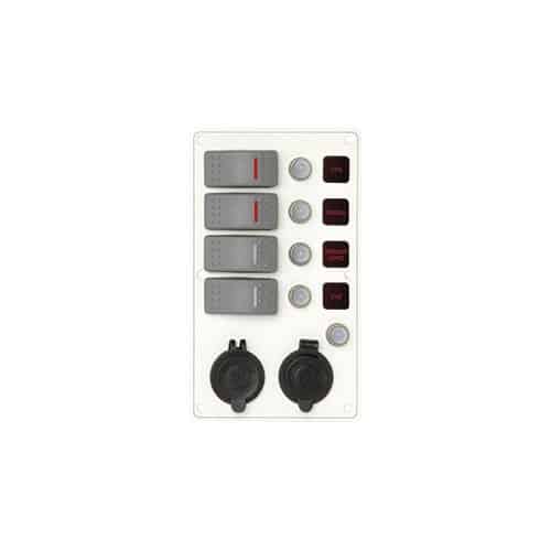 Pannelli 12/24V di qualità superiore in Alluminio compatti e impermeabili IP66. Precablati, con interruttori impermeabili dotati di spie LED rosse e valvole automatiche reinseribili con cappuccio di protezione. Il primo interruttore è (ON)-OFF per segnalazione acustica. Compresi di 30 etichette prestampate da applicare negli alloggi retroilluminati LED. Montaggio verticale oppure orizzontale.
