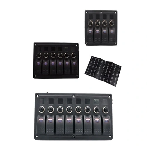 Pannello elettrico di comando in ABS con interruttori a bascula retroilluminati a LED blu, relativi dispositivi termici riarmabili e barra di connessione per i negativi. Completo di targhette adesive di identificazione utenze.
