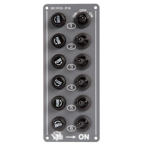 Pannello elettrico a interruttori con cappuccio in gomma e portafusibili in vetro da 6×32 mm.