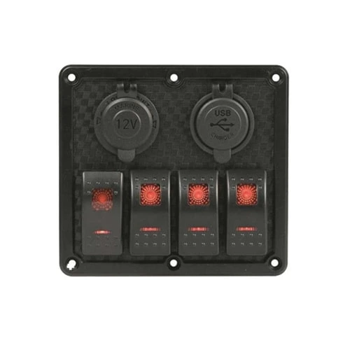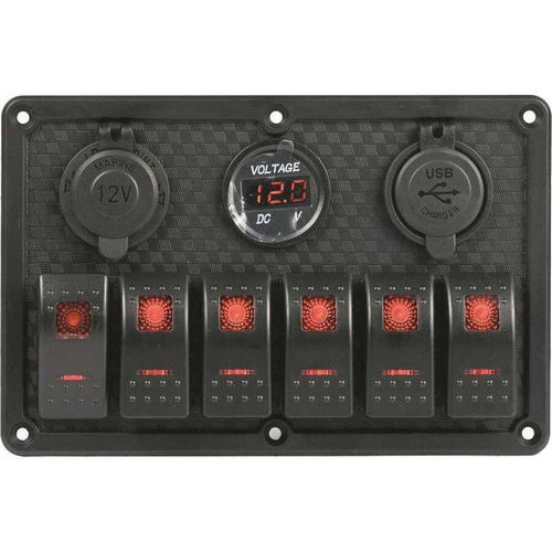 Pannello comando con sei interruttori impermeabile da 20A in polimero con interruttori basculanti a led rossi completi di fusibili, viti ed etichette prestampate. Nel pannello pulsantiera sono presenti preso 12 volt, presa USB e voltometro.