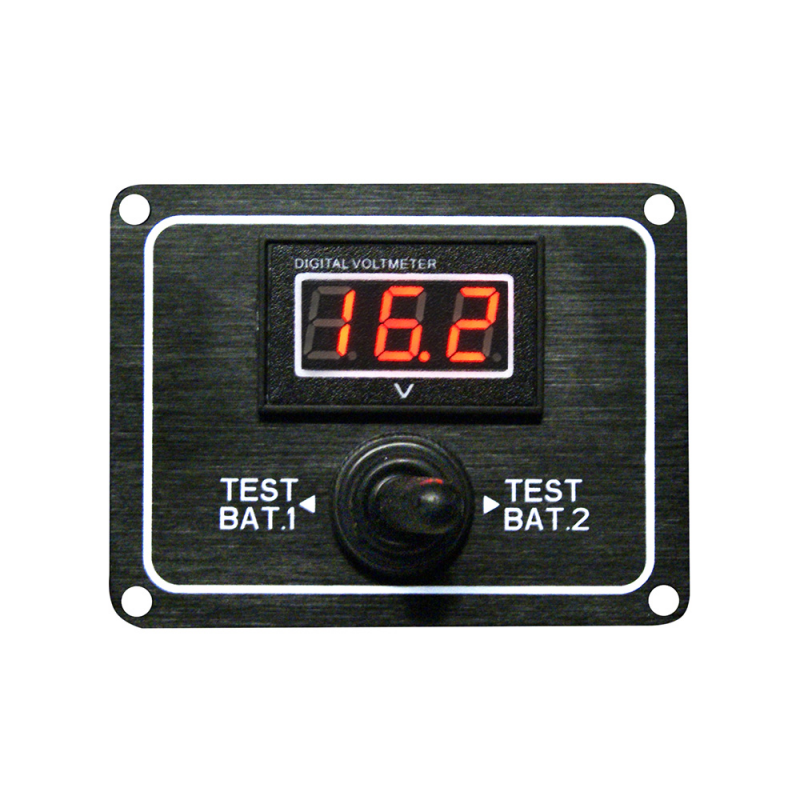 Pannello in lega leggera verniciato nero con indicatore digitale che permette di verificare lo stato di due batterie separate o di due gruppi batterie separati.