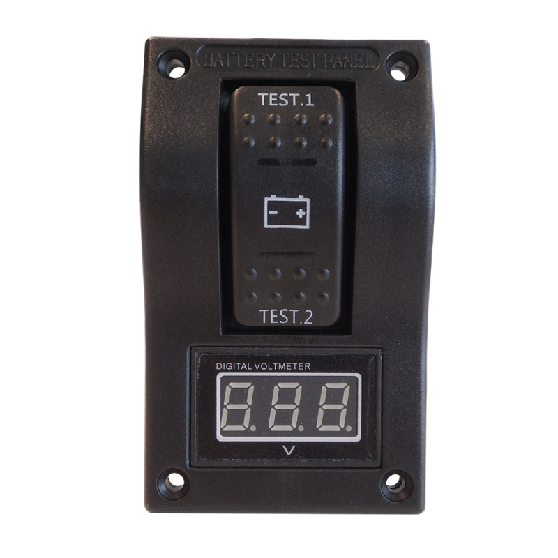 Pannello per test batterie a 12/24 vdc con voltmetro a 3 cifre di facile lettura e deviatore di selezione.Permette di verificare lo stato di 2 batterie separate o di due gruppi batterie separati.
