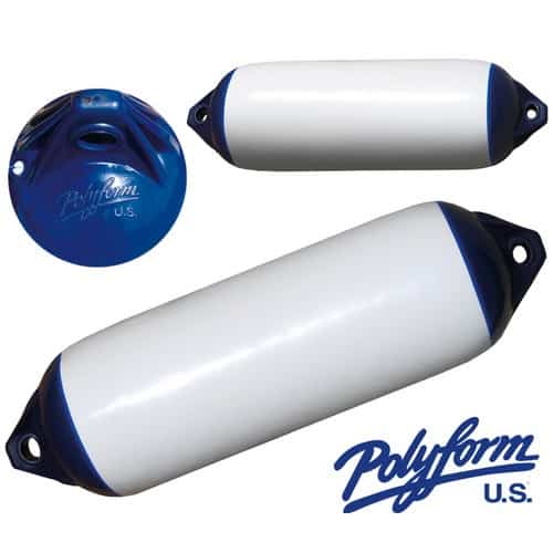 Parabordi gonfiabili cilindrici di colore bianco con testate blu, originali Polyform U.S. Provvisti di valvola di gonfiaggio e sgonfiaggio e pareti robuste con due fori di aggancio rinforzati. Il modello F4 può essere utilizzato anche come rullo di alaggio per scafi.