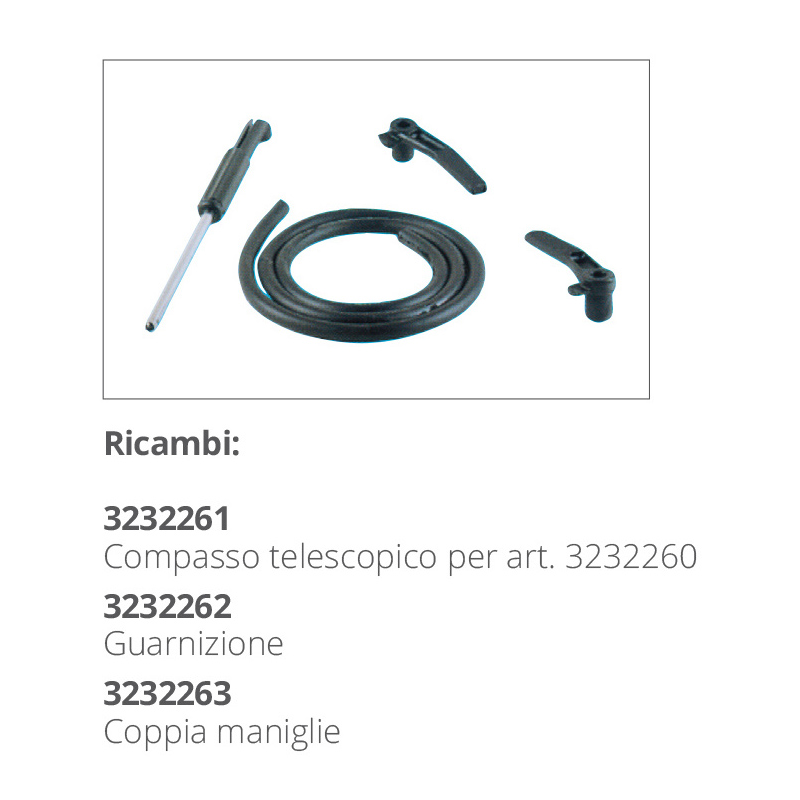 | Tipo | COMPASSO TELESCOPICO, COPPIA MANIGLIE, GUARNIZIONE, PASSO UOMO PLASTICA MM.448X268, PASSO UOMO PLASTICA MM.480X480 |
