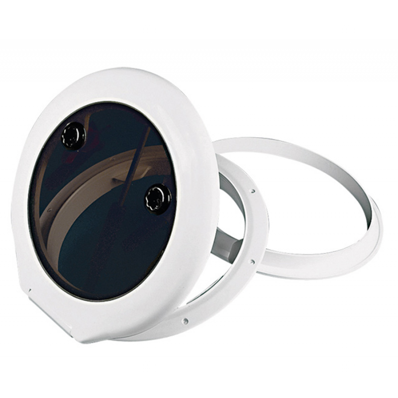 Passo uomo in ASA bianca uv resistente, lastra in plexiglass spessore mm. 8. Cornice interna di rifinitura, chiusura con maniglie, compasso telescopico con possibilità di apertura totale. Sporgenza sulla coperta mm. 27.