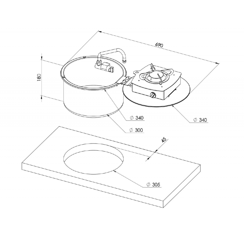 Piano cottura a ribalta 1 fuoco (1 da 1750 W) in acciaio inox completo di lavello Ø mm. 340 x mm 180h, rubinetto pieghevole e fermapentole, il piano è provvisto di coperchio in vetro temperato