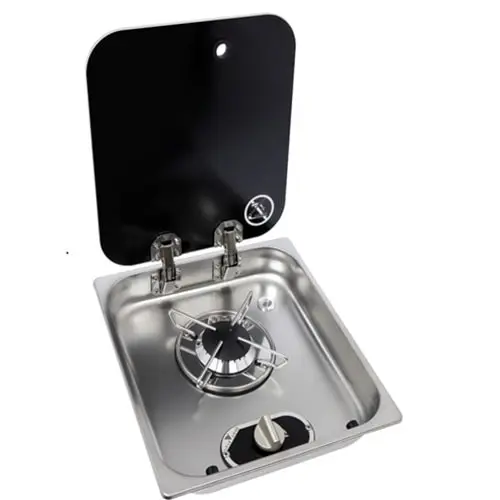 Piano cottura ad incasso con coperchio in vetro nero fumè, temperato, autobloccante, cerniere a scomparsa griglia di supporto in inox con gommini antivibrazione.