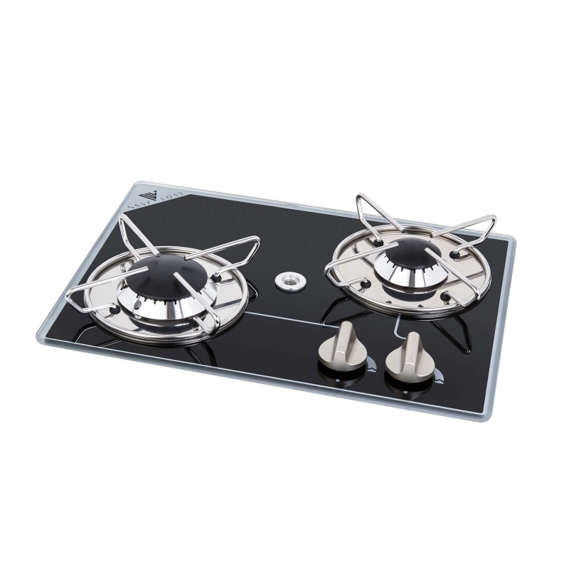 Piano cottura a gas con accensione manuale, in vetro temperato nero con spessore di 8 mm. Montaggio ad incasso. Con termocoppia di sicurezza. Con foro per ferma pentole. Certificati CE.