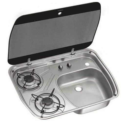 Lavello con fornello compatto in acciaio inox satinato con coperchio in vetro, termosicurezze e piletta.