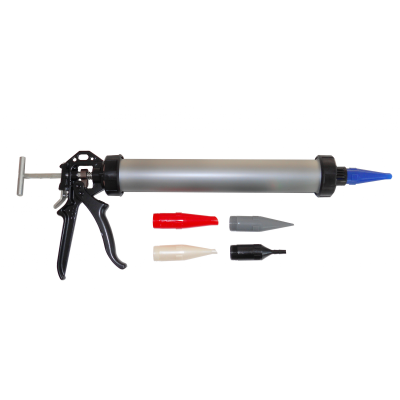 Pistola a tubo in alluminio per sacchetti fino a ml. 600. Tipo professionale per applicatori di sigillanti. Completa di 5 ugelli