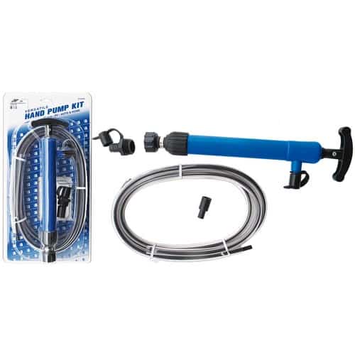 Pompa manuale a doppia mandata per estrazione olio da motori entrobordo ed entrofuoribordo. Completa di tubazione in plastica da inserire nel foro dell’astina controllo olio, tubo di dcarico e riduzioni.