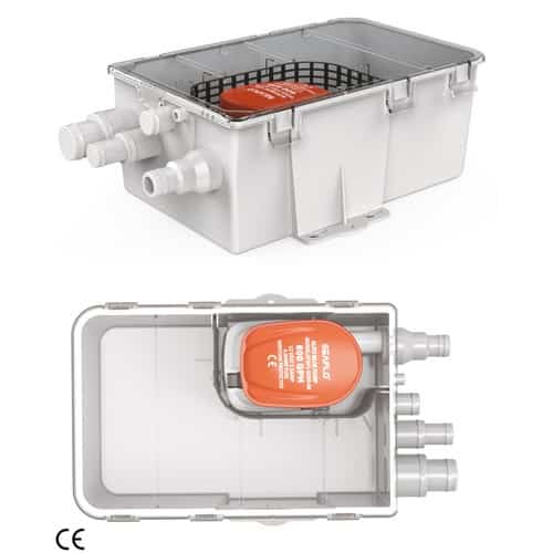 Pozzetto raccolta acqua. Pompa 750 GPH di svuotamento per doccia progettata per l’utilizzo su imbarcazioni provviste di lavello ad incasso, doccia, o vasca da bagno, per pompare tutta l’acqua dagli scarichi dentro al serbatoio di raccolta. compatta, può essere montata a pavimento oppure a parete, in quest’ultimo caso eliminando i due sostegni. E’ dotata di una pompa di sentina automatica incorporata che si attiva appena il galleggiante avverte la presenza dell’acqua. Inoltre ha un filtro che può essere facilmente pulito togliendo la copertura superiore trasparente ed è provvista di una valvola di non ritorno collegata al tubo di scarico. L’involucro della pompa è fabbricato in resistente polipropilene ed il coperchio in acrilico. Il sistema di prosciugamento ha 3 tubi di entrata (2 da 19,1 mm (3/4”) e 1 da 25,4 mm (1”) ed un tubo di scarico con valvola di non ritorno per tubo di diametro da 19,1 mm (3/4”) e 25,4 mm (1”).