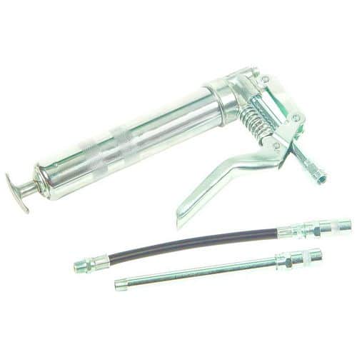 Pompa ingrassatrice in acciaio inox venduta in blister contenente due prolunghe, una rigida ed una flessibile, ed una cartuccia di grasso al litio di capacità gr. 85