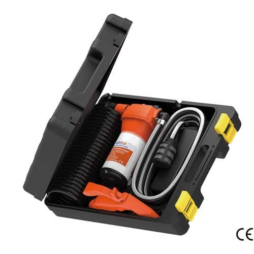 Kit completo di pompa lavaggio autoadescante con regolazione automatica sia della portata che della pressione, 6 mt di tubo spiralato resistente ai raggi U.V., 2 mt di tubo per carico acqua, pistola, cavo con spina accendisigari da 2,4 mt e raccordi.