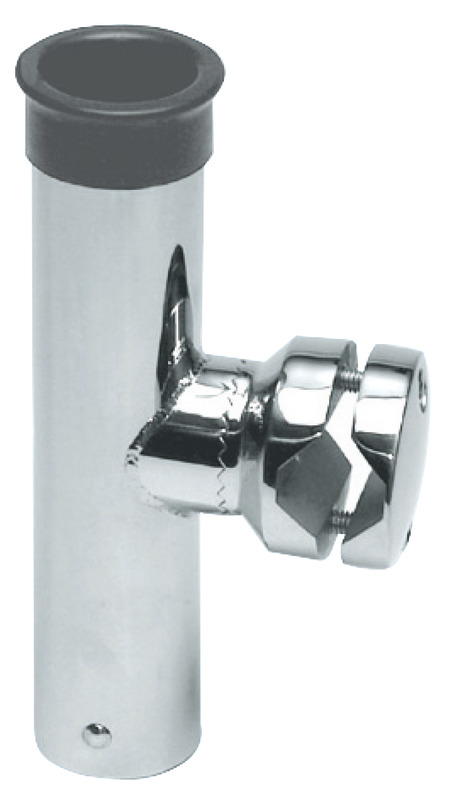 Orientabile a 360° sia orizzontalmente che verticalmente. Presenta la particolarità di avere la regolazione tramite una vite che passa attraverso il tubo porta canne, per cui non occorre svitare il morsetto per la regolazione. Realizzato in acciaio inox AISI 316 microfuso e lucidato + boccola in santoprene.