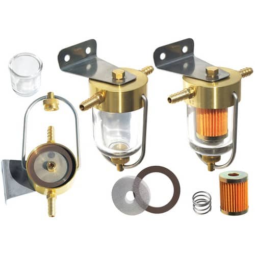 Prefiltro per benzina e gasolio, completo di supporto in ottone cromato e calotta d’ispezione trasparente che consente il controllo dei residui, impurità e depositi.