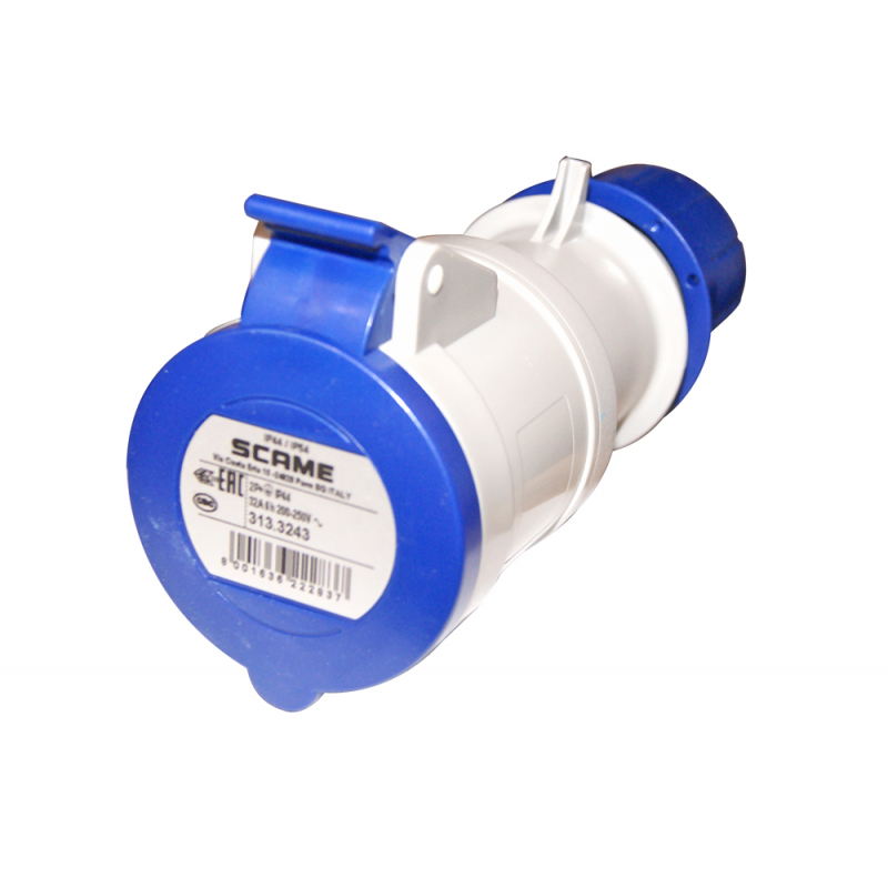 Presa blu con tappo 2P da 32A per equipaggiamento impianto elettrico con grado di protezione IP44. Presa per prolunga.