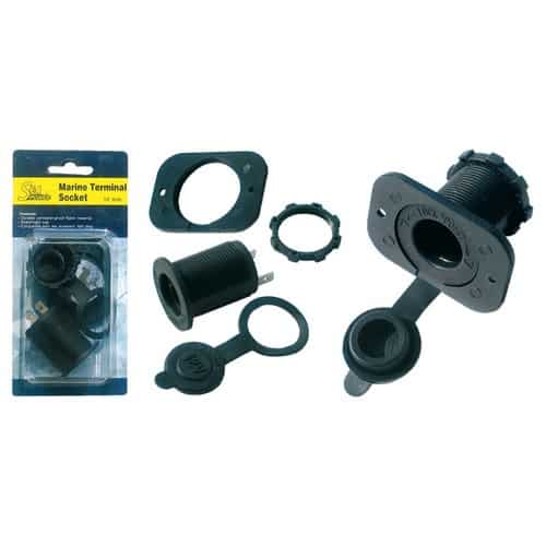 Presa di corrente ad incasso in policarbonato nero, tipo accendisigari dotato di cappuccio a tenuta stagna che impedisce l’ingresso dell’acqua.
