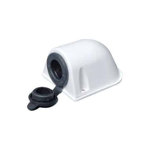 Presa corrente completamente impermeabile, sia con la presa chiusa dal cappuccio in dotazione, sia quando è inserita la spina, che è dotata di uno speciale collare stagno e di un sistema “lock-in” che permette di bloccare la spina ruotandola. Completa di carenatura in plastica e guarnizione di base, per il montaggio in piano o a soffitto.