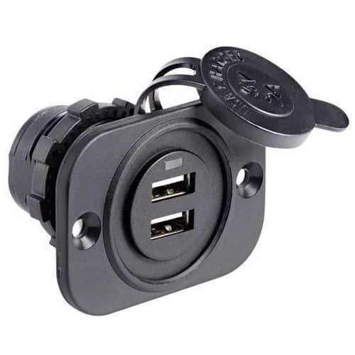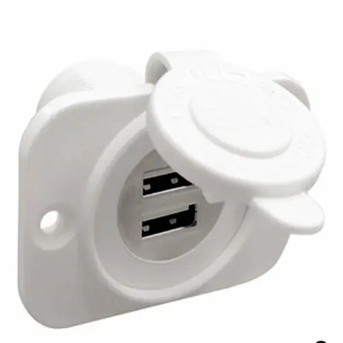 Presa doppia USB, fissaggio con dado posteriore fabricata in nylon con cappuccio di protezione per renderle impermeabili.