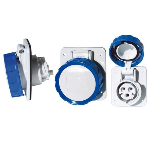 Presa fissa ad incasso serie IEC 200-250V./16A a 3 poli 2P+T. Costruita in materiale isolante termoplastico autoestinguente, coperchio di protezione a molla con ghiera di bloccaggio a baionetta.