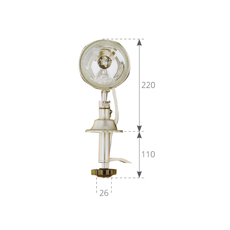 Proiettore in acciaio inox orientabile a mano dall’interno della cabina, orizzontale di 360° e verticale di 45°, lampadina alogena da 55 W., 12 V.