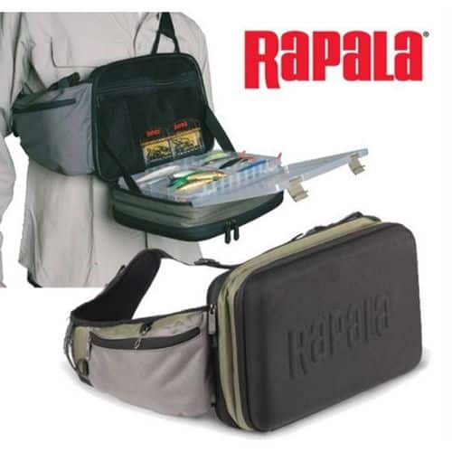 Borsa Rapala ottima per la pesca in movimento che consente di trasportare il materiale dietro la schiena ma con un semplice movimento a 180°abbiamo un vassoio aperto con due scatole porta minuteria in dotazione a rapido accesso. Accessori per pesca spinning.