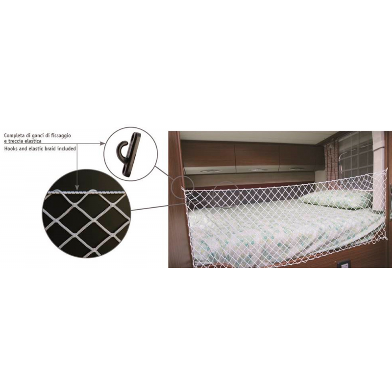 Rete protezione per cuccette in poliestere bianco, completa di ganci di fissaggio e treccia elastica.