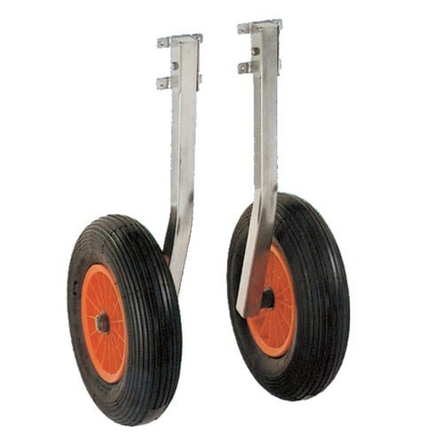 Coppia ruote alaggio a ribalta per battelli pneumatici e piccole imbarcazioni. Gambo e attacchi in ACCIAIO INOX, cerchi in nylon rinforzato, pneumatici a sezione larga.
