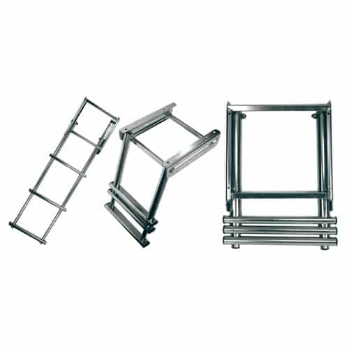 Scaletta da plancetta a scomparsa con tre gradini telescopici costruita in ACCIAIO INOX. Possibilità di montarla sopra e sotto la plancetta.