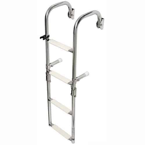 Scaletta pieghevole con attacchi arcuati in acciaio inox lucidato a specchio con attacchi arcuati sopra coperta, per una più comoda risalita. Modello con gradini con superficie ovalizzata. Il gradino ovale, rispetto ai tradizionali tondi, é molto più agevole e comodo nell’uso. I gradini nella parte superiore sono ricoperti di pedana in plastica antiscivolo.