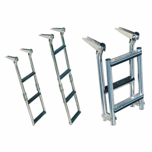 Scaletta serie “BOEING” costruita interamente in ACCIAIO INOX e coprigradini in gomma antiscivolo. Ideale per installazioni su plancette, piattaforme, poppe sporgenti ecc. É ripieghevole su se stessa sopra la plancetta.