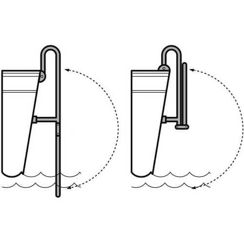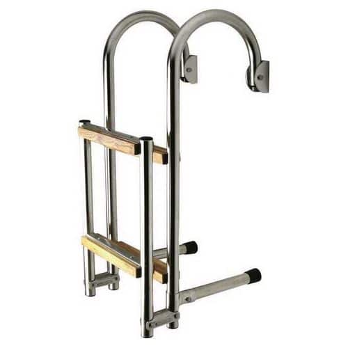 Scaletta pieghevole in acciaio inox con curve passamano e gradino rivestito con legno trattato.