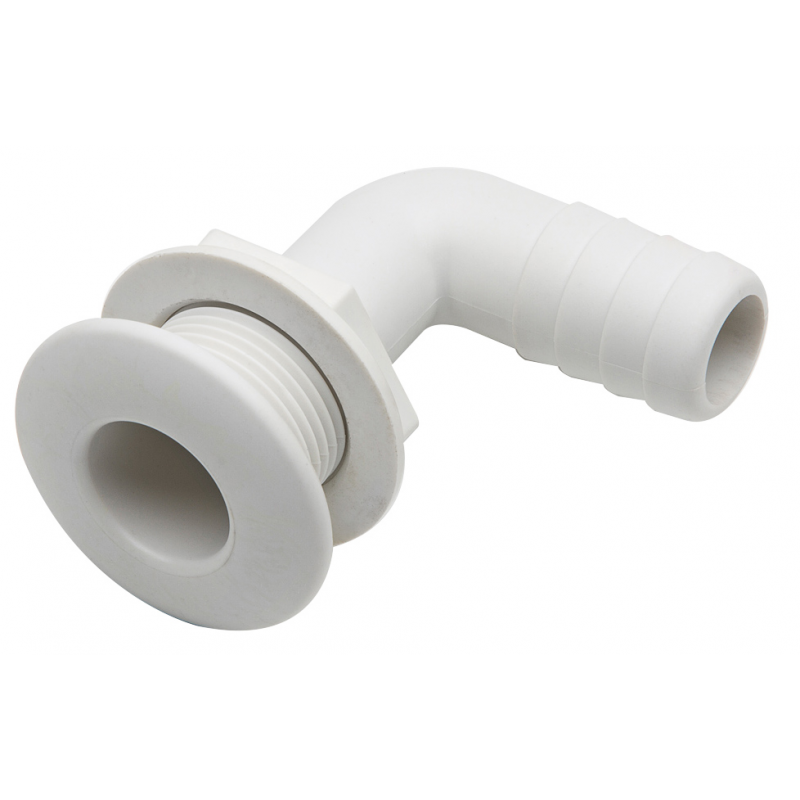 Scarico a mare curvo 90°in nylon bianco completo di ghiera e portagomma. Accessori per sentina e vano motore, scarico.
