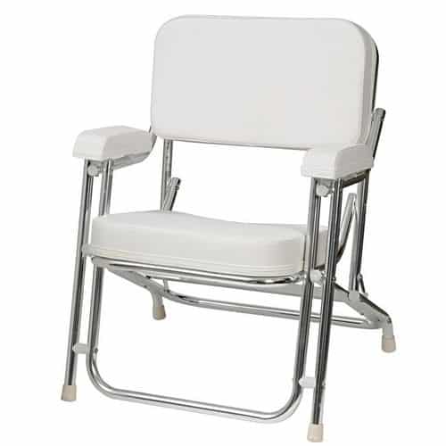 Sedia completamente In alluminio anodizzato. I cuscini, lo schienale e i braccioli sono in skay bianco con interno in poliuretano espanso morbido. E’ pieghevole per un facile stivaggio.