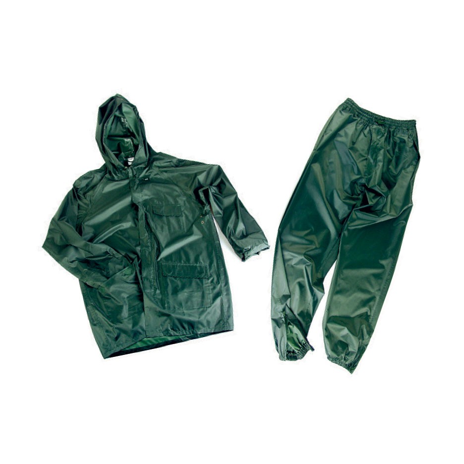 Completo antipioggia, giacca e pantalone impermeabili realizzati in PVC. Giacca con cerniera intera, cappuccio inserito al collo, 2 tasche anteriori, cordino stringivita, elastici ai polsi. Pantalone con elastico in vita, 2 tasche passamano laterali e bottoni di chiusura al fondo gambale. Munito di un pratico sacchetto per il trasporto.