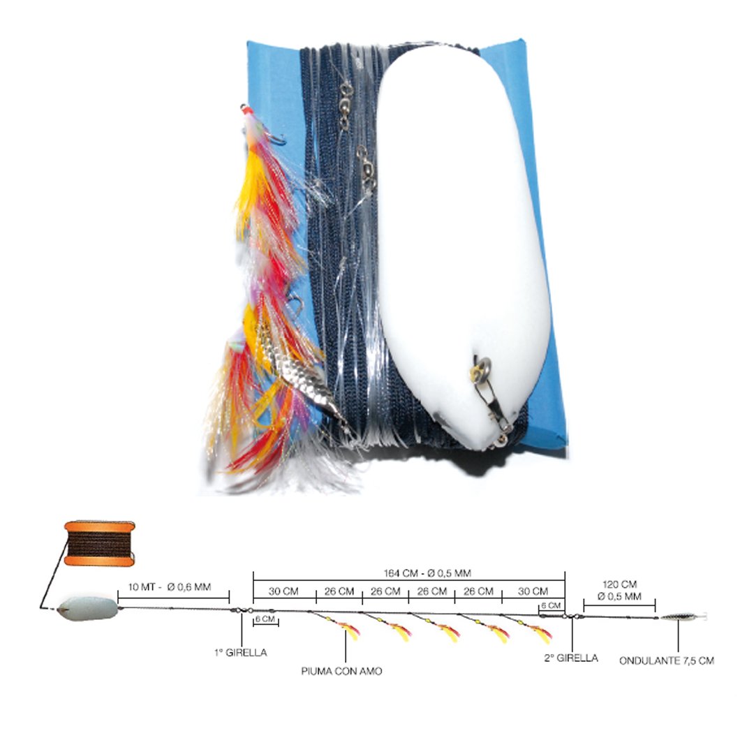 Divergente montato con piume, 2 girelle, 5 ami ed ondulante da 7.5 CM. Completo di sughero e pronto all’uso.