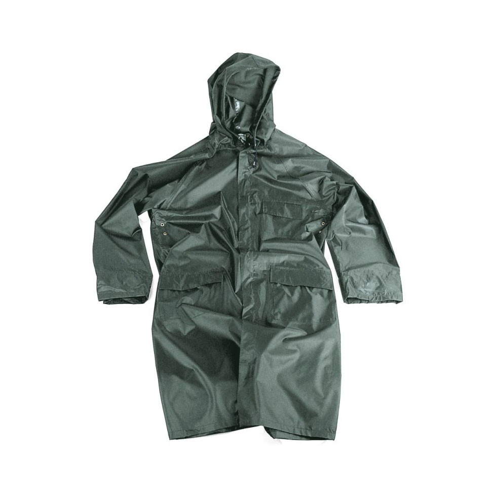 Giacca impermeabile con cerniera intera, cappuccio al collo con cordino e 3 tasche. Realizzato in PVC resistente, ideale per pioggia, neve e vento.
