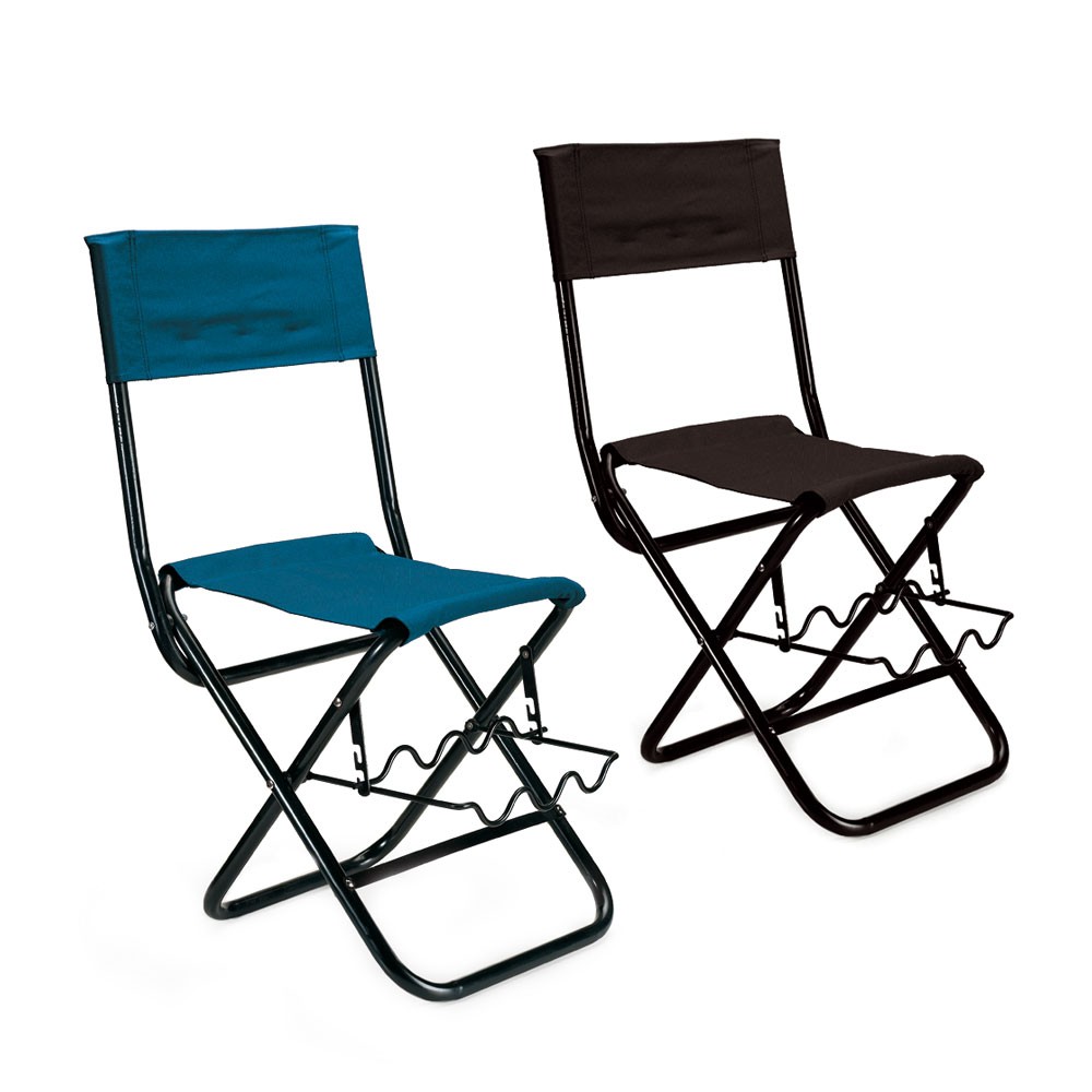 Sedia richiudibile completa di porta canne e tracolla. Struttura in alluminio ed elementi in stoffa.