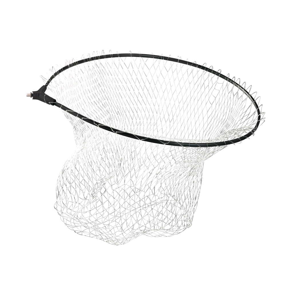 Teste di guadino ovale con rete nylon nera, munita di e blocco in plastica.