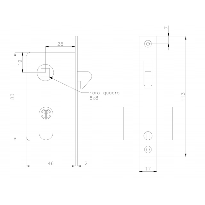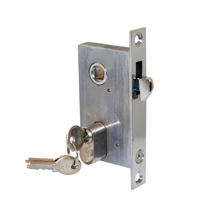 Serratura da incassoin ottone cromato con cilindro, per porte scorrevoli. Incasso mm. 83×17, quadro mm. 8.