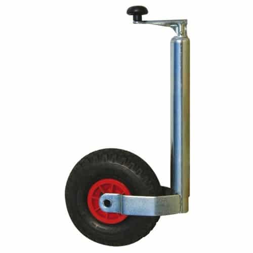Servotimone telescopico per rimorchi e roulottes, con maniglia girevole e ruota pneumatica.