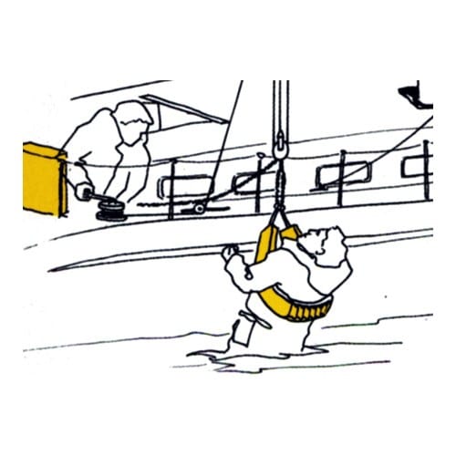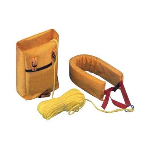 Sistema di recupero Safeling M.O.B. (Man Over Board – Uomo a Mare). Cintura galleggiante e 40 m di sagola conforme Dir. Europea 89/686 EEC. Contenitore con fibbie di fissaggio alla barca.