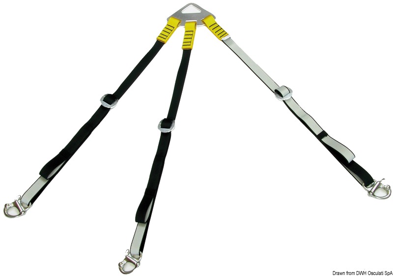 Di alta qualità, resistente UV per sollevamento tender di qualsiasi tipo. Piastra di sospendita e fibbie di regolazione in alluminio alta resistenza anodizzato. Moschettoni aggancio in acciaio inox AISI 316 ad apertura rapida. Carico max KG 400. Universali per qualsiasi gommone, in quanto regolabili. Articolo brevettato e certificato CE.