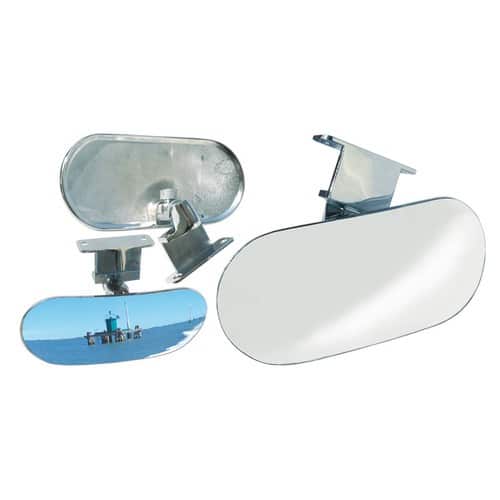 Specchio retrovisore per sci nautico realizzato in zama cromata con superficie concava. Completo di base e chiavetta per il montaggio sia orizzontale che verticale.