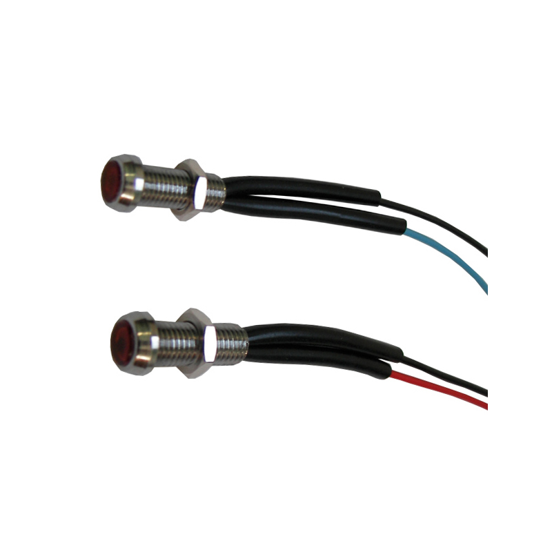 Spia luminosa a led rosso, corpo in ottone cromato, lente in policarbonato, fissaggio con dado per pannello comando e consolle.
