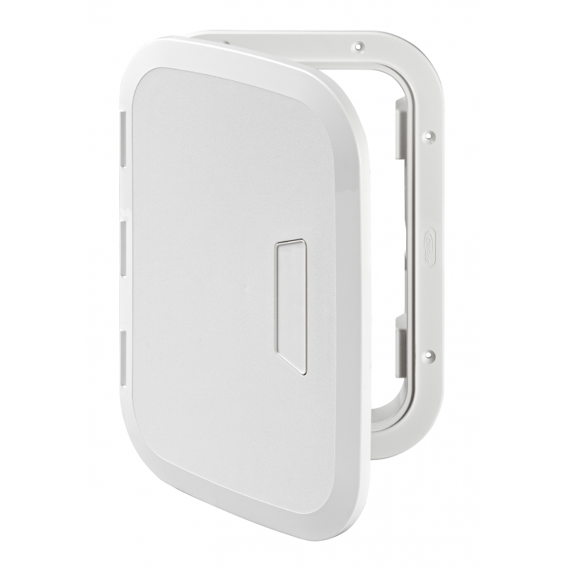 Sportello in ASA, colore bianco , resistente ai raggi UV, apribile a 180° con maniglia push-pull e chiusura a scatto. Montaggio verticale